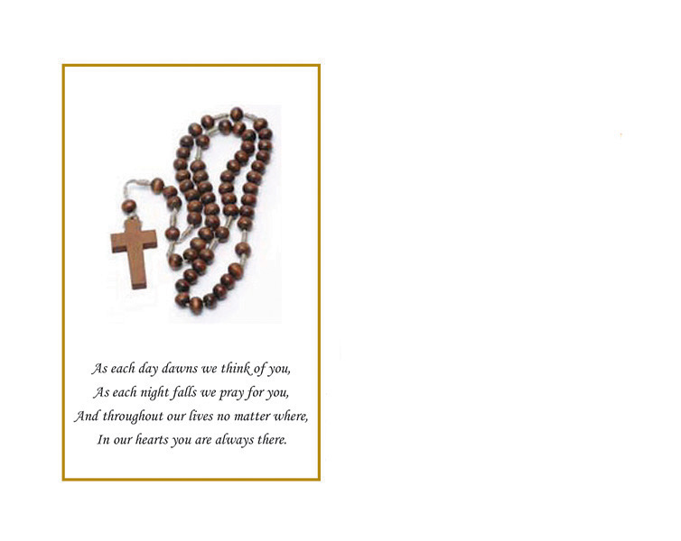 Memoriam Card with a Picture of a Rosary Beads on the front and also on the back any verse of your choice (or just leave blank). On the inside of the card you have the deceased details name, address, date of death etc. Photo can be oval or square with or without a Gold border. You can also supply a Colour pic which can be faded into the background if you wish.